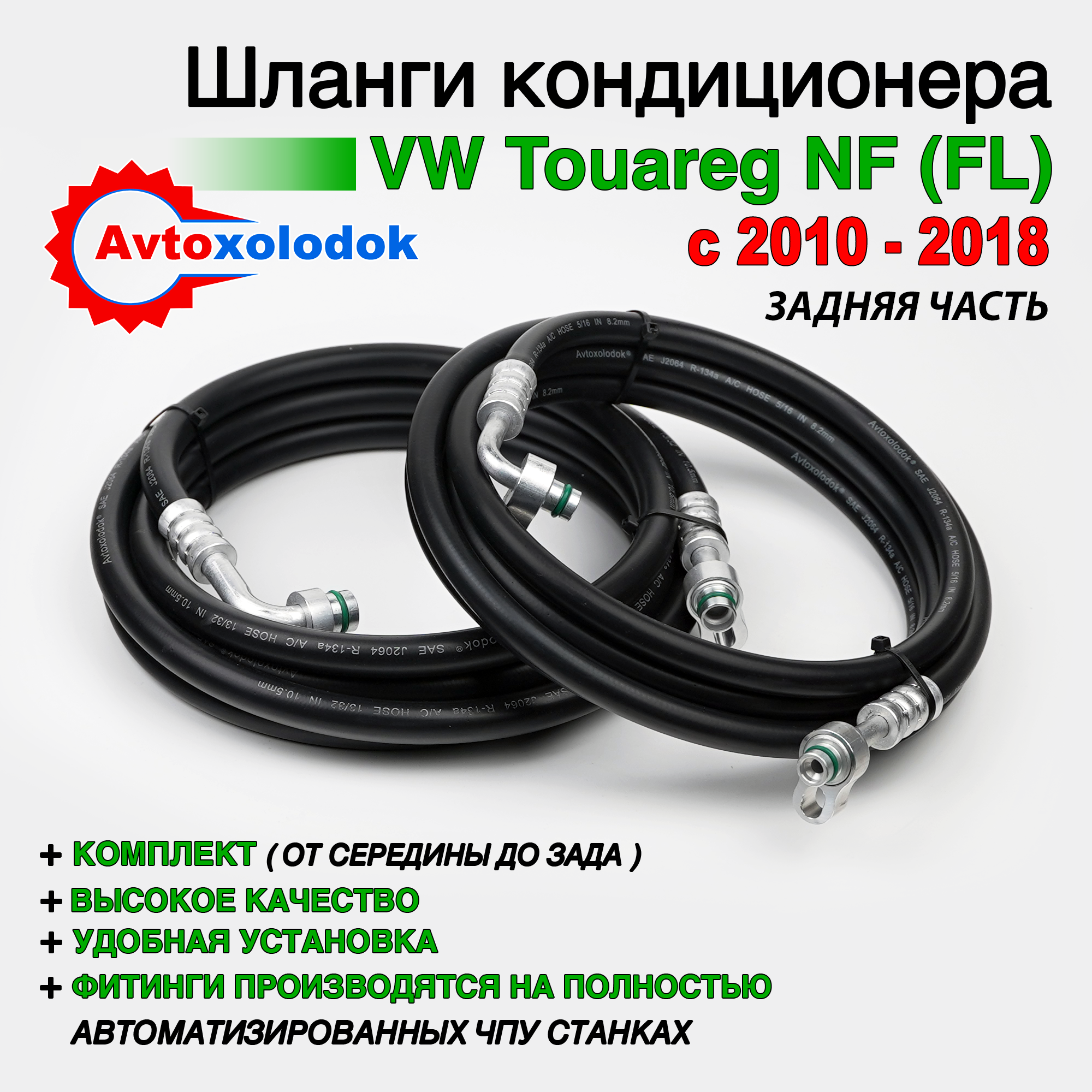 Магистрали изготовлены из специализированных кондиционерных шлангов Avtoxolodok предназначенных под хладагент R134a, стандарта SAE J2064, обладают высокой устойчивостью к химическим реагентам, которые активно разрушает штатные алюминиевые трубки заднего контура автокондиционера на автомобилях Volkswagen Touareg NF