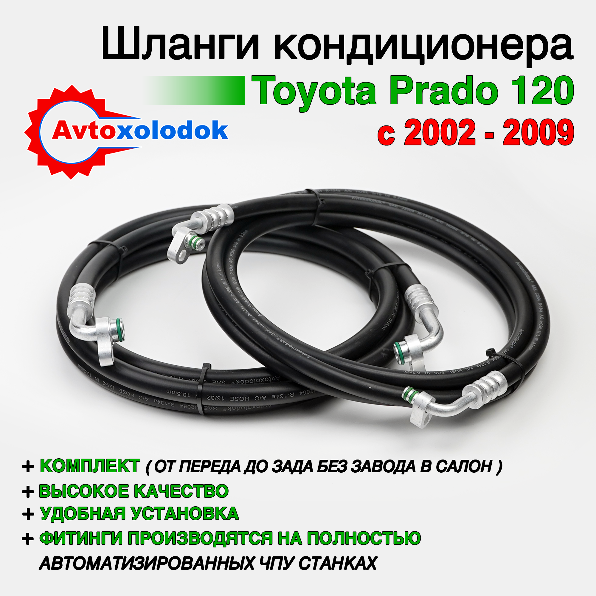 Магистрали изготовлены из специализированных кондиционерных шлангов Avtoxolodok предназначенных под хладагент R134a, стандарта SAE J2064, обладают высокой устойчивостью к химическим реагентам, которые активно разрушает штатные алюминиевые трубки заднего контура автокондиционера на автомобилях Toyota Prado 120